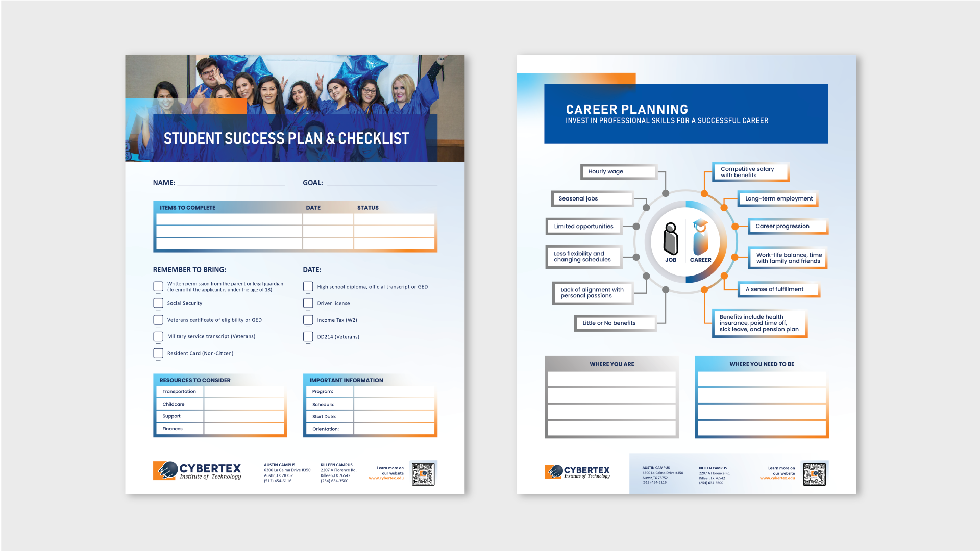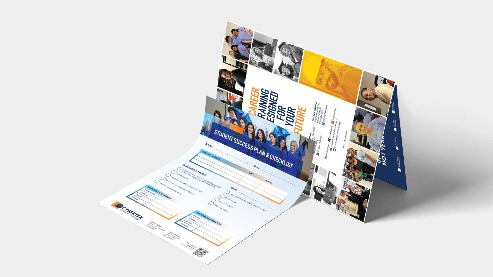 The resulting print design system successfully aligned with CyberTex’s mission and their career-focused educational services. Through collaborative work with the client’s team, the content and visuals were structured to be both informative and inviting.